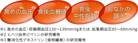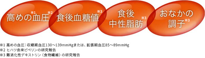 本品には、難消化性デキストリン(食物繊維)およびヒハツ由来ピペリンが含まれます。 難消化性デキストリン(食物繊維)には、食後血糖値の上昇を抑制する機能があることが報告されています。また、食後血中中性脂肪値の上昇を抑制する機能があることが報告されています。さらに、おなかの調子を整える機能があることが報告されています。 ヒハツ由来ピペリンには、血圧が高めの方の血圧を下げ、正常な血圧を維持する機能があることが報告されています。 |