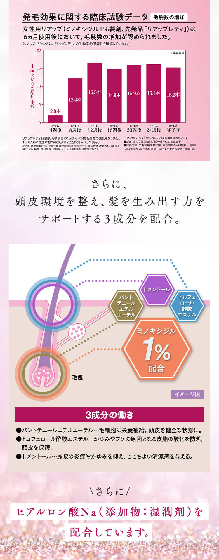 【用法・用量】成人女性(20歳以上)が、1日2回、1回1mLを脱毛している頭皮に塗布してください。