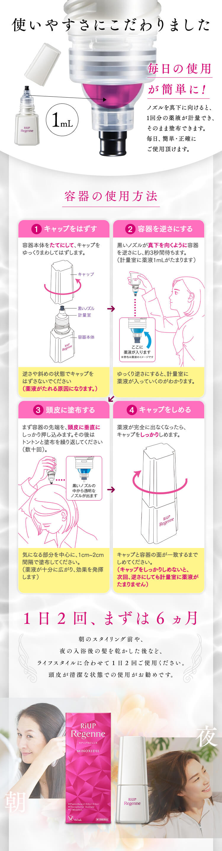 1回1mLのご使用は、脱毛範囲の大小に関係なくお守りください。1mLは塗り広げれば、頭皮全体に十分に行きわたる量として設計してあります。なお、容器は1mLを計量できるタイプです。