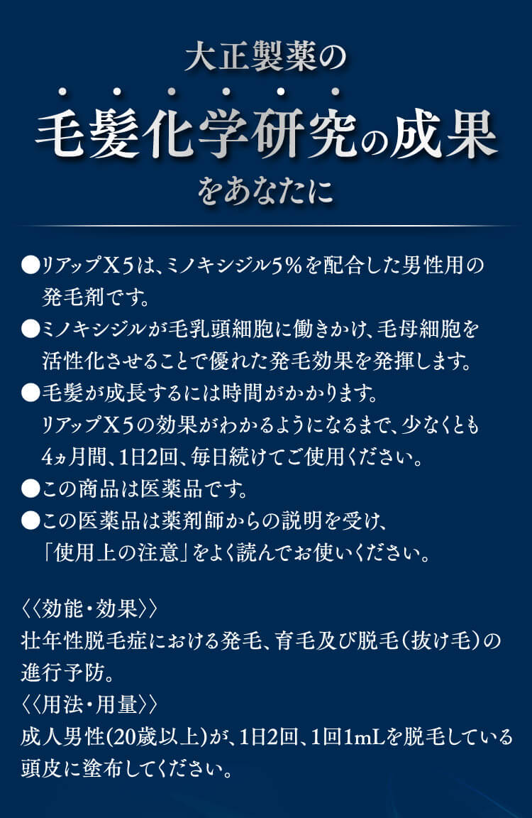 成人男性(20歳以上)が、1日2回、1回1mLを脱毛している頭皮に塗布してください。