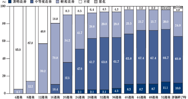 4週間毎に、「著明改善」「中等度改善」「軽度改善」「不変」「悪化」の5段階で評価しています。4週間後にはすでに軽度改善が見られるようになり、8週間後には被験者の1割以上に、12週間後には6割近くに軽度改善が見られました。24週間後、つまり約6ヵ月後からは「軽度改善」「中等度改善」「著明改善」をあわせて、実に9割以上に改善が見られます。24週間後から「軽度改善」より「中等度改善」の評価の割合が高くなっています。