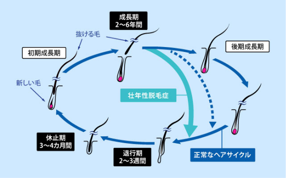なおAGAは、androgenetic (=男性ホルモンの)alopecia(=脱毛症)の略称で、男性ホルモンと遺伝が関連した薄毛または抜け毛のことを指します。髪は一定の周期で生まれて成長し、自然に抜けるのを繰り返していますが、この周期を「ヘアサイクル(毛周期)」と呼びます。ヘアサイクルには、髪が伸びる「成長期」、成長が止まる「退行期」、脱毛の準備が進む「休止期」の3段階があり、通常3~8年周期で毛髪が生まれ変わります。ところが、壮年性脱毛症やAGAの方は男性ホルモンの影響でこのサイクルが乱れ、通常2~6年ある成長期が2~3年などと短くなり、毛髪は太い毛に成長しないまま退行期、休止期に移行し、抜け落ちてしまいます。