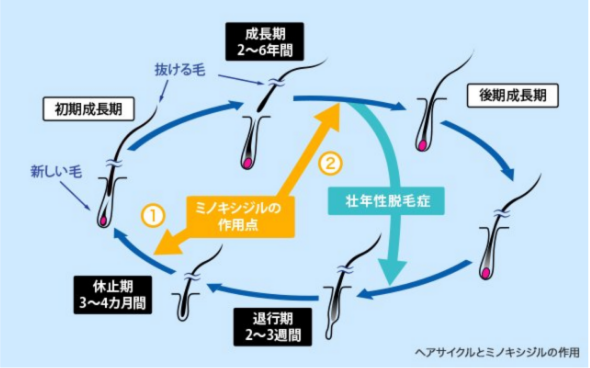 - ※1 ミノキシジルが毛包に直接作用し、細胞の増殖やタンパク質の合成を促進して毛包を活性化。ヘアサイクルにおける休止期から初期成長期への移行を促進し、発毛を促すこと