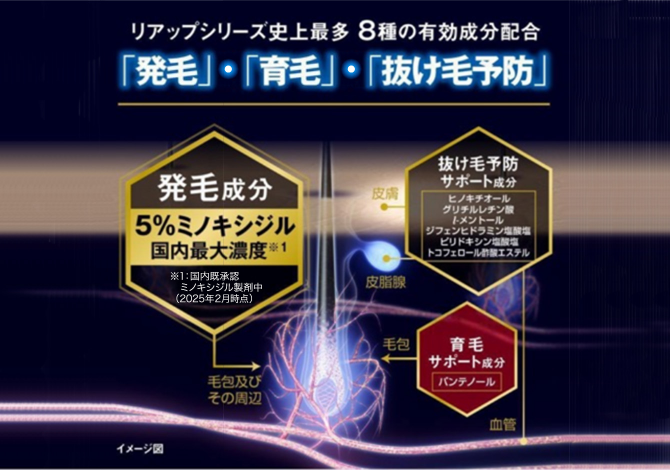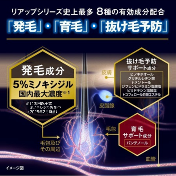 発毛成分ミノキシジル国内最大濃度5%を含め、リアップシリーズ史上最多となる8種の有効成分を配合!