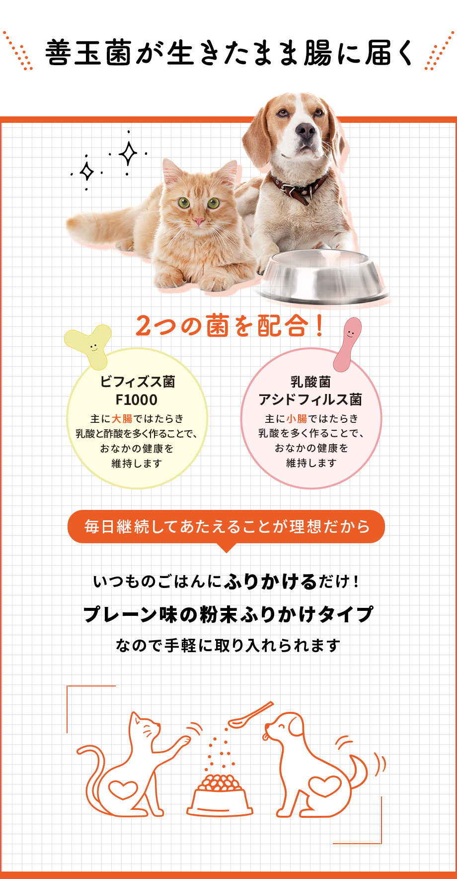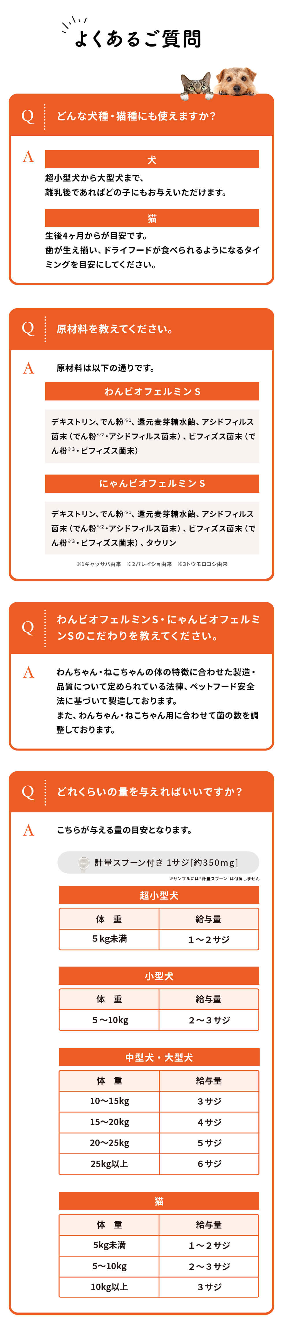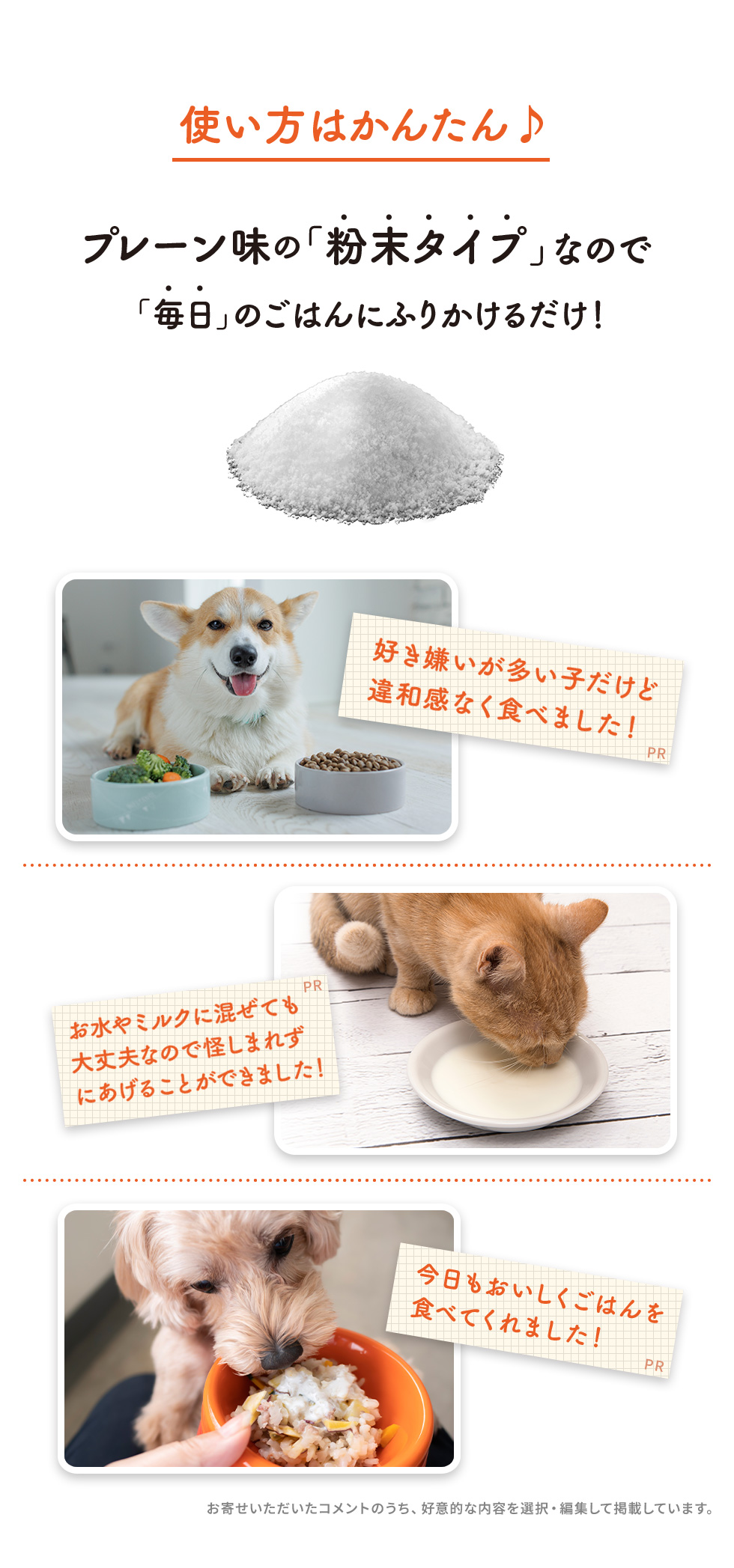 | 用法 | そのままのフードにふりかけるか、ミルク等に混ぜて与えてください。 |