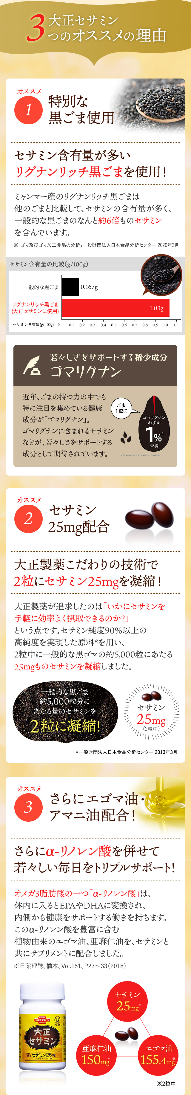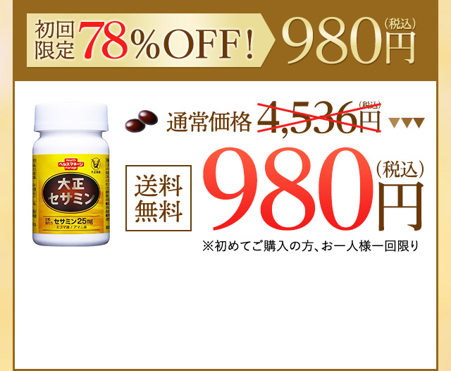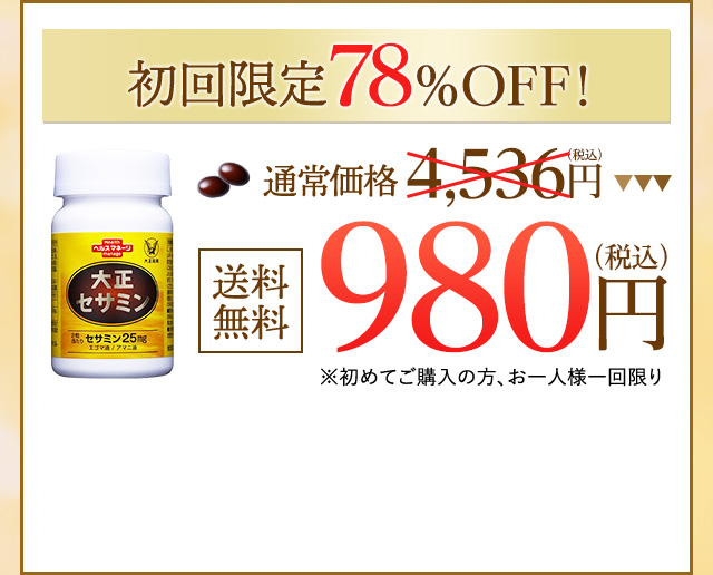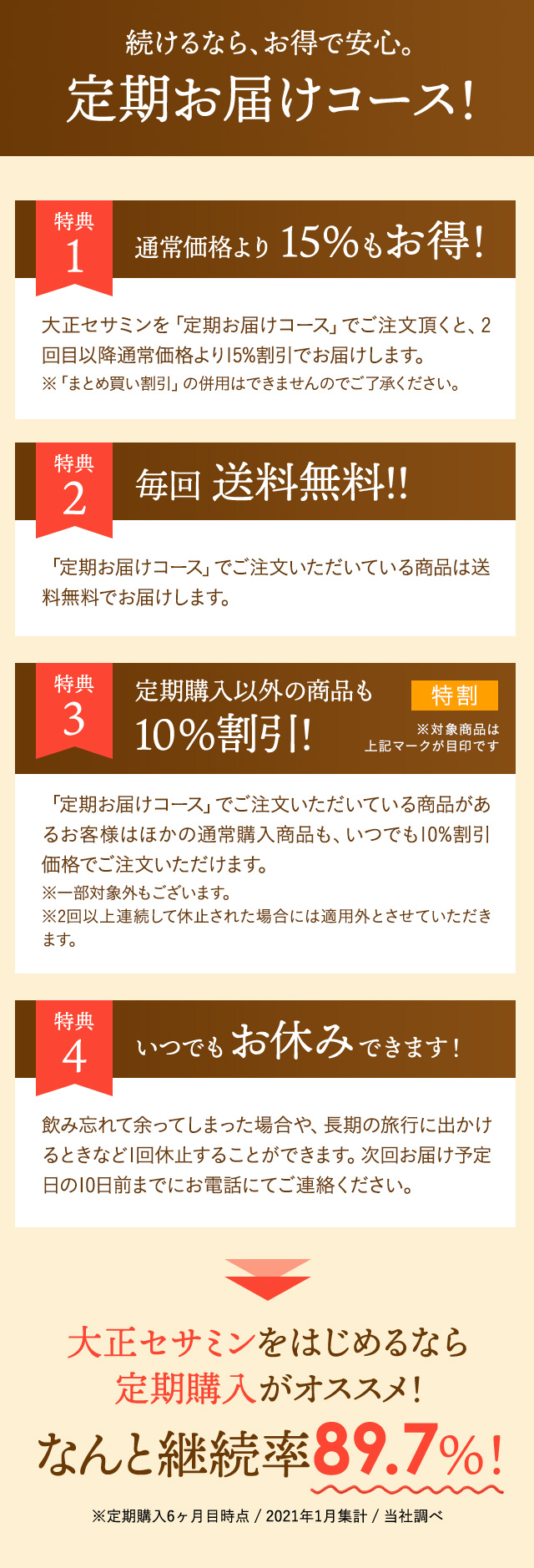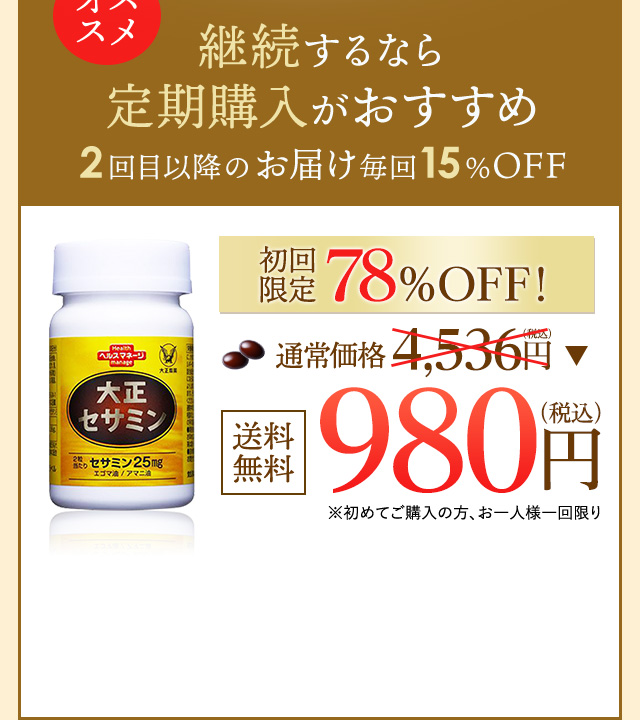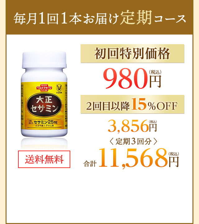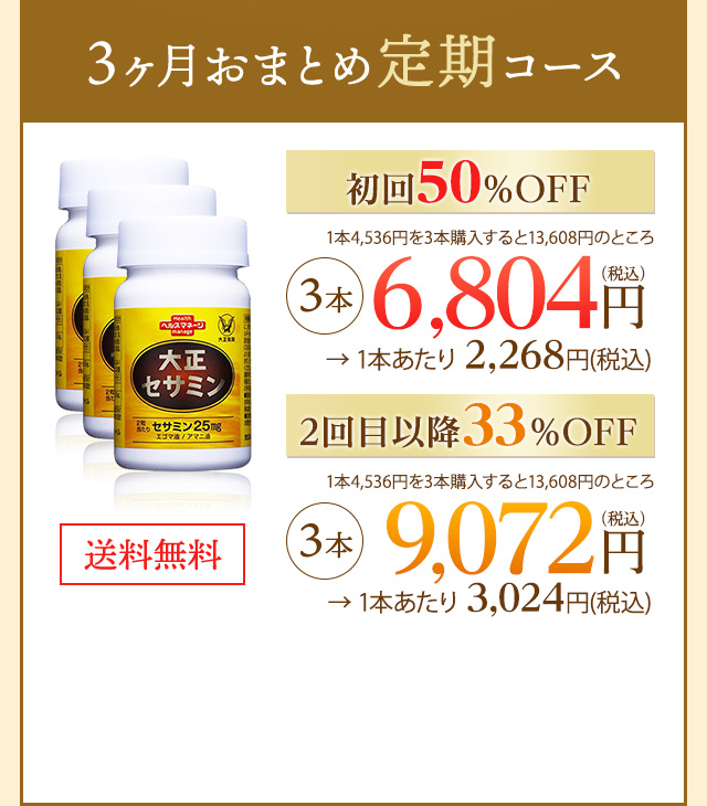 - 「大正セサミン3ヶ月おまとめ定期コース」初回は税込6,804円、2回目以降は税込9,072円となり初回と同じ数量でのお届けになります。定期購入について詳細はこちら