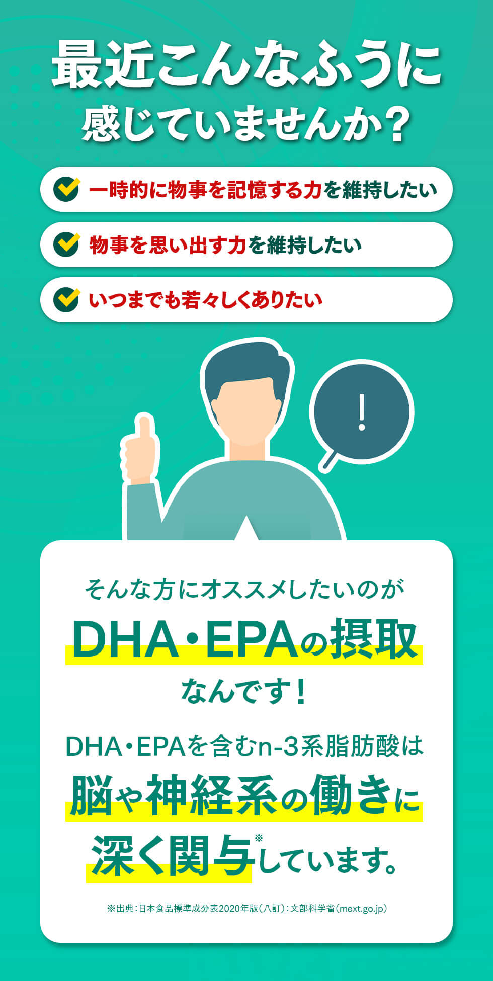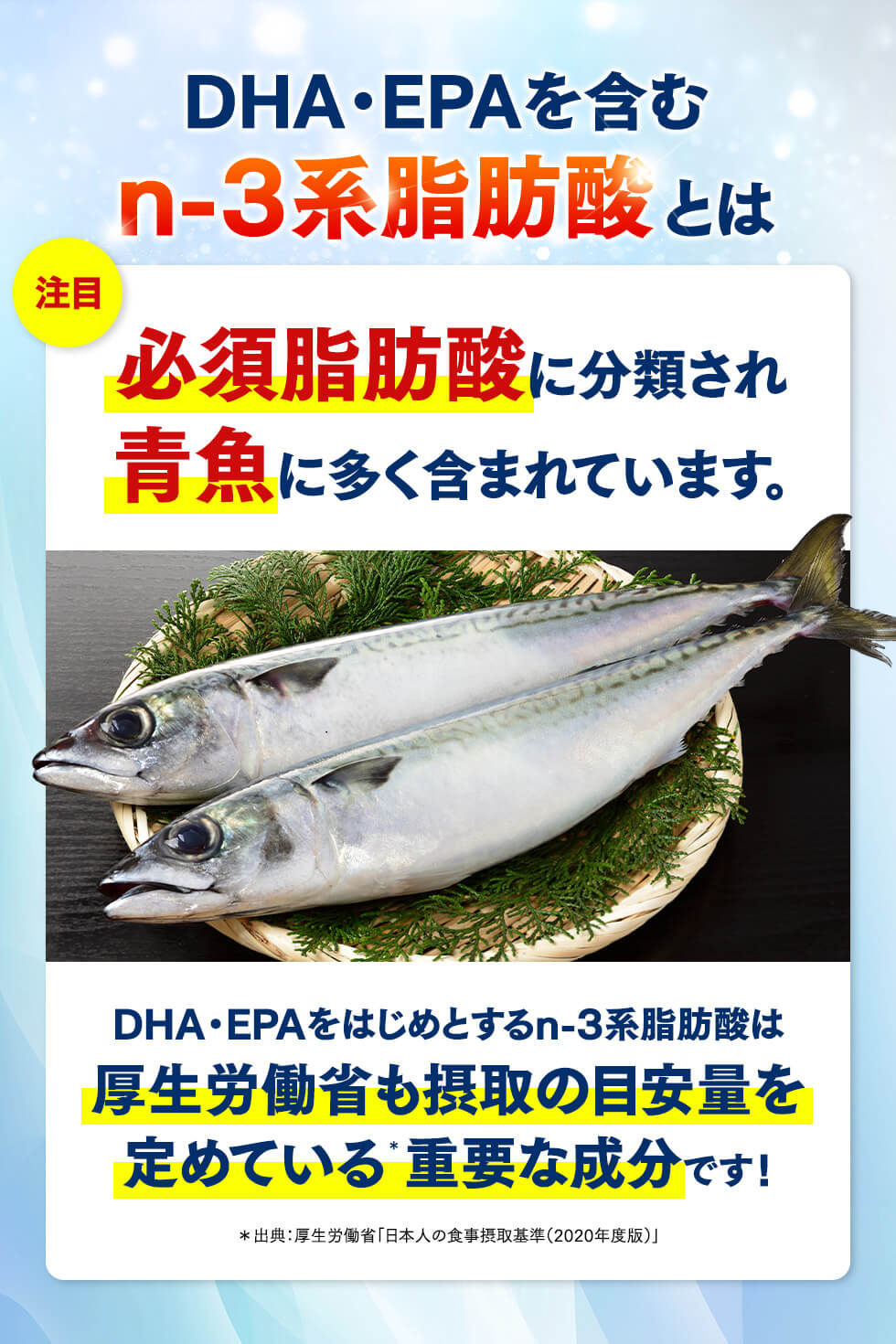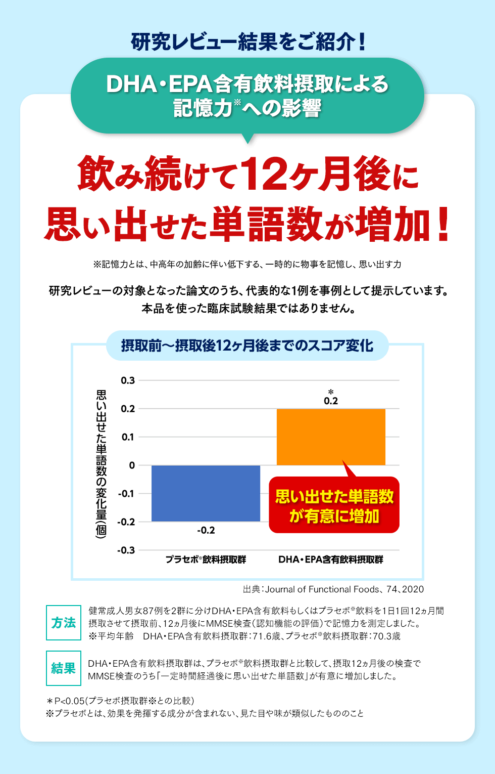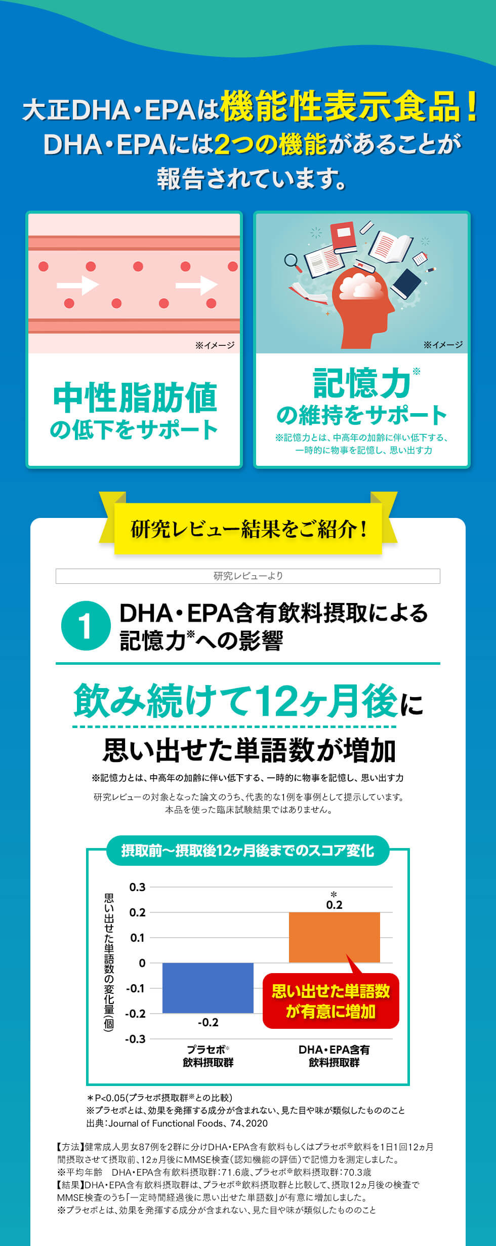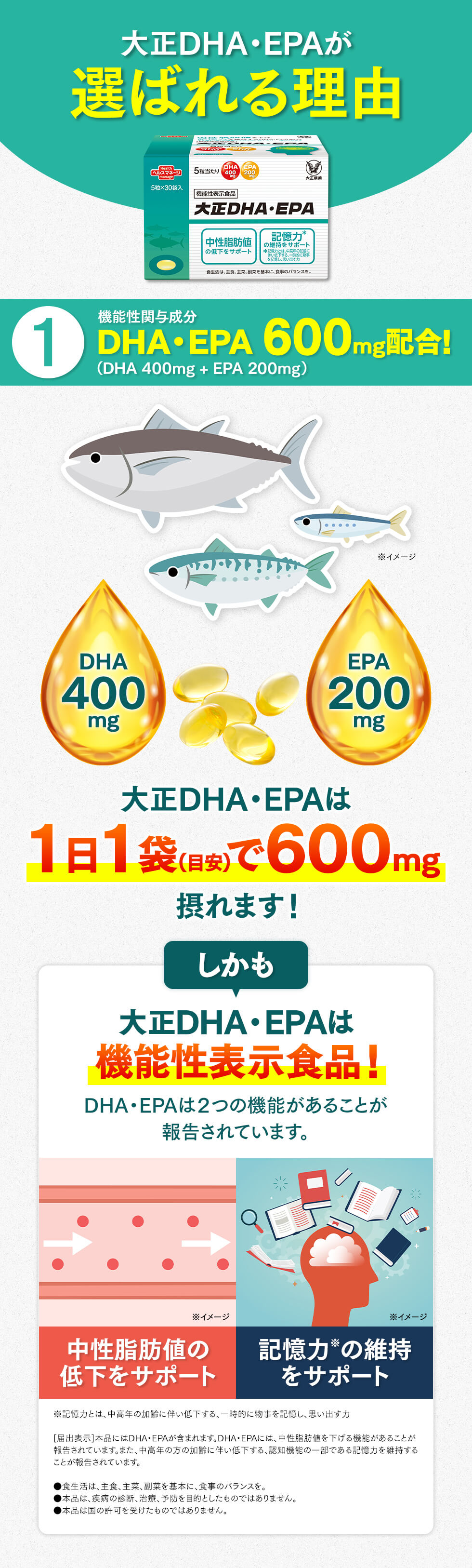 届出表示 本品にはDHA・EPAが含まれます。DHA・EPAには、中性脂肪値を下げる機能があることが報告されています。また、中高年の方の加齢に伴い低下する、認知機能の一部である記憶力を維持することが報告されています。※記憶力とは、一時的に物事を記憶し、思い出す力をいいます。