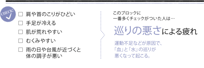 漢方の知恵で女性の疲れを解消! あなたの疲れのタイプをチェック! 疲れの基本的な対策は食事と睡眠ですが疲れの原因に応じたケアを行うとさらに効果的です。まずは自身の疲れの原因を把握しましょう。 下記の疲れのタイプは、肉体的な疲れと加齢に伴う疲れの2つが当てはまるなど、複数当てはまるケースがほとんどです。チェックがついたタイプの対策はすすんで取り入れていきましょう。 ⇒対策はこちら ⇒対策はこちら ⇒対策はこちら ⇒対策はこちら ⇒対策はこちら ⇒対策はこちら 1 2 3 4 5 6